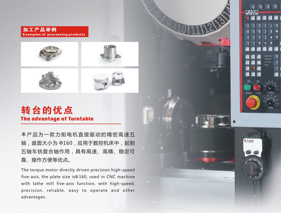 3.五軸車銑多用,效率高。配合主軸可實(shí)現(xiàn)車銑復(fù)合高效五軸加工,低速銑削時(shí)可進(jìn)行精確分度,車削時(shí)可實(shí)現(xiàn)高速大扭矩旋轉(zhuǎn),從而大幅度提升加工效率;并且本轉(zhuǎn)臺(tái)采用自主專利的剎車結(jié)構(gòu),剎車可靠且不影響臺(tái)面精度。