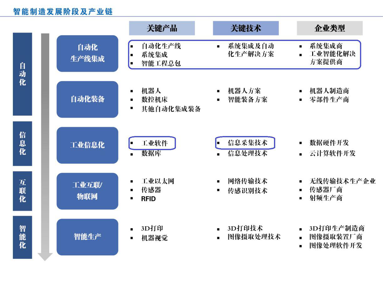 在智能制造、無人工廠、工業(yè)互聯(lián)網(wǎng)等大量概念和信息前,很多人都懵了!我們用下圖來為大家呈現(xiàn)智能制造的發(fā)展階段和產(chǎn)業(yè)鏈構(gòu)成:智能化并非一蹴而就,而是先由自動化到信息化,再由互聯(lián)化發(fā)展到智能化;在不同發(fā)展階段,生產(chǎn)制造商和服務(wù)商都需面對并解決相關(guān)的課題,主要集中在關(guān)鍵技術(shù)和關(guān)鍵產(chǎn)品上。圖中藍(lán)色框內(nèi)部分就是我司的產(chǎn)品和服務(wù)定位,希望此圖對您有所幫助。